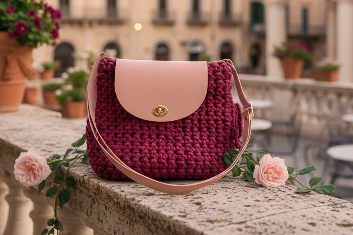 Un sac crocheté aux teintes profondes, inspiré des places italiennes au coucher du soleil. Élégant et romantique, Rosalia accompagne chaque instant avec charme et douceur.