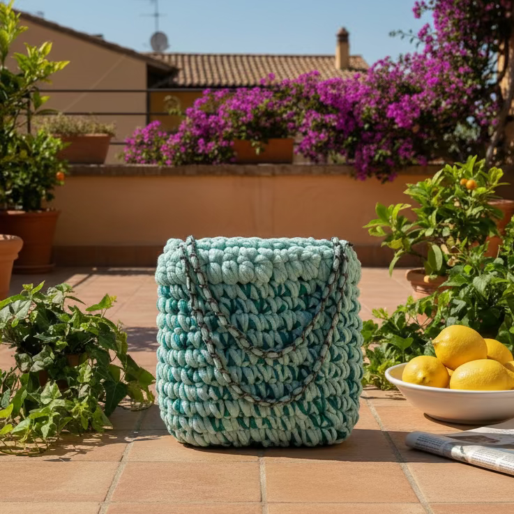Un sac crocheté aux reflets turquoise, frais comme une terrasse italienne au soleil. Léger, lumineux et plein de dolce vita.