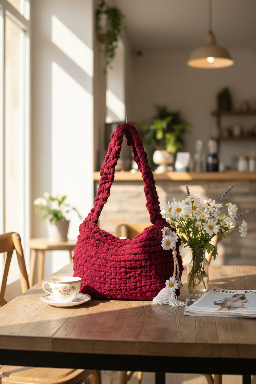Inspiré des terres toscanes et de leurs couleurs riches, ce sac en crochet bordeaux mêle authenticité, chaleur et élégance naturelle.