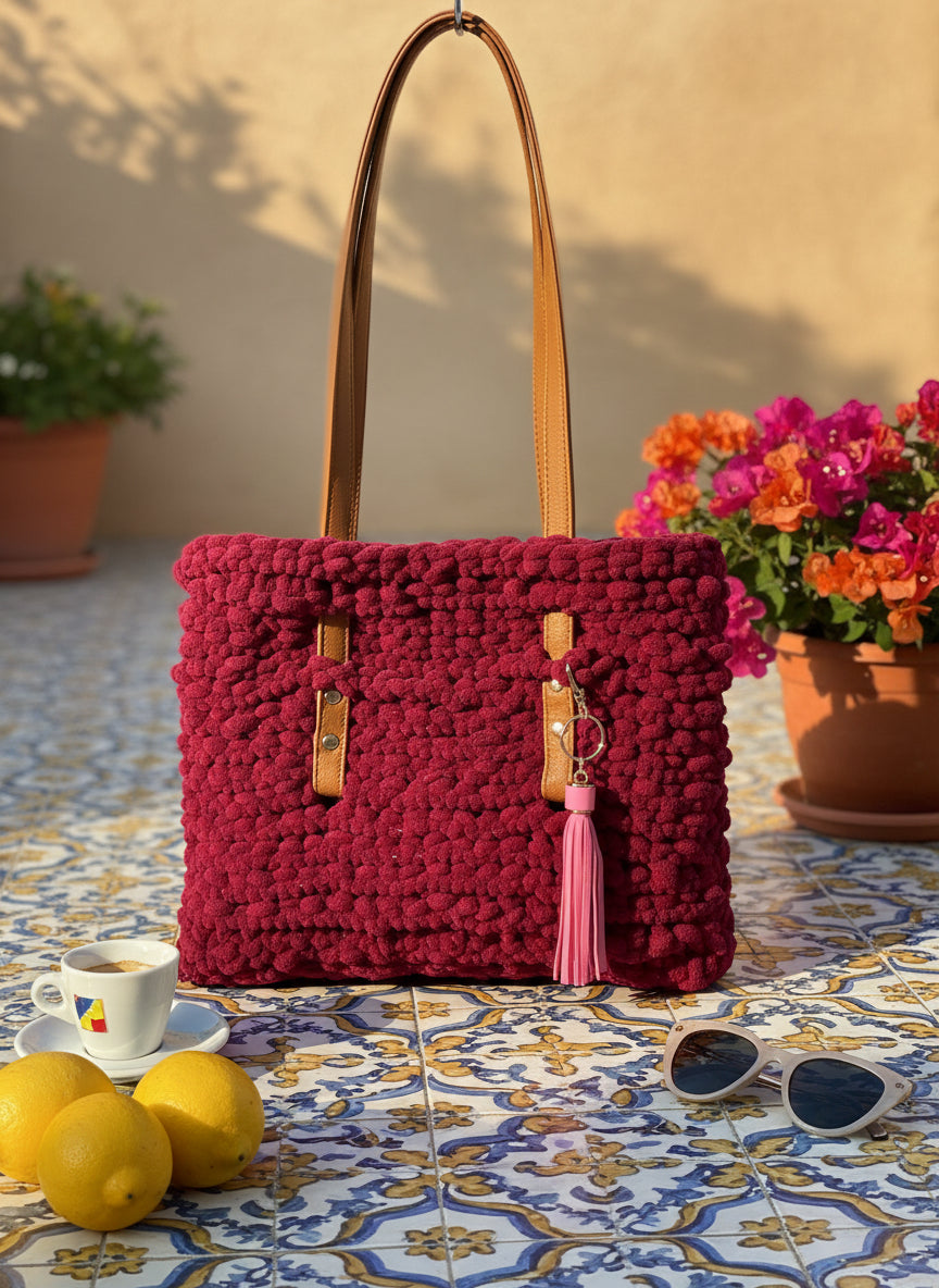 Intense et raffiné, ce sac bordeaux évoque les soirées italiennes baignées de lumière. Crocheté à la main, il apporte une touche chic et intemporelle à toutes les tenues.