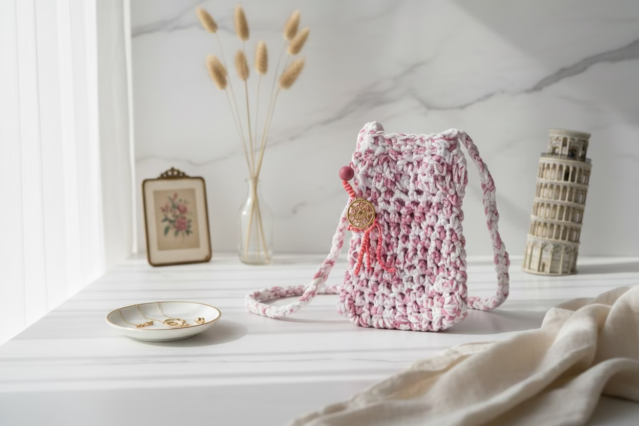 La pochette Piccola Vita est réalisée à la main au crochet, pensée pour accueillir l’essentiel.